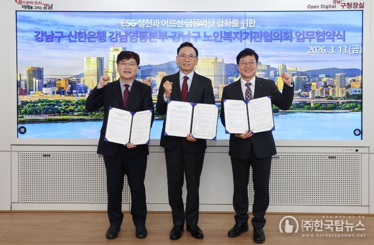 ㈜한국탑뉴스 송행임 기자 | 꿈이 모이는 도시, 미래를 그리는 강남구가 13일 구청에서 ㈜신한은행 강남영동본부, 강남구 노인복지기관협의회와 3자 업무협약을 체결하고 어르신 금융역량 강화 교육을 추진한다. 이번 협약은 디지털 금융환경 변화에 따른 어르신들의 금융 소외를 예방하고, 보이스피싱 등 금융사고로부터 안전한 일상을 지원하기 위해 마련됐다.
