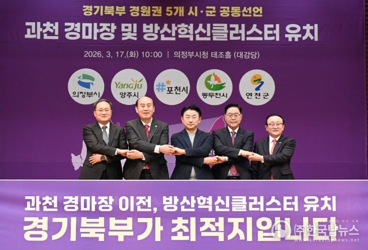 ㈜한국탑뉴스 차복원 기자 | 양주시는 17일 의정부시청 대강당에서 의정부·포천·동두천시·연천군과 함께 ‘과천경마공원 이전 및 방산혁신클러스터 경기북부 유치’를 위한 공동 선언문을 발표했다.