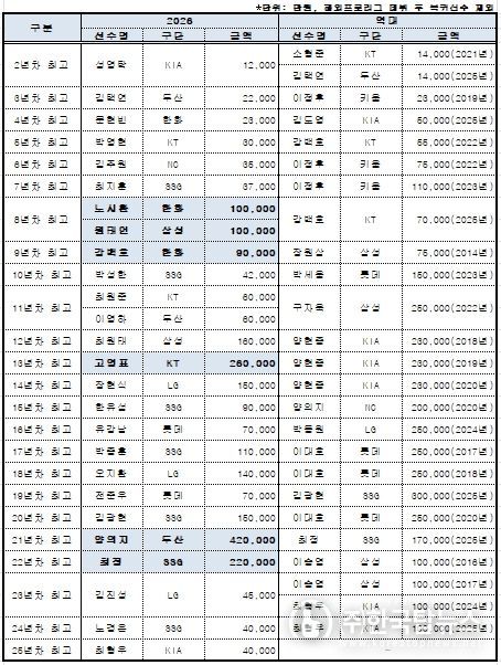 또한 2026시즌부터 시행되는 아시아쿼터 선수들의 연봉도 집계됐다. LG 웰스, SSG 타케다, 두산 타무라가 각각 20만 달러씩 받으며 아시아쿼터 선수 연봉(계약금 포함) 공동 1위에 올랐다.