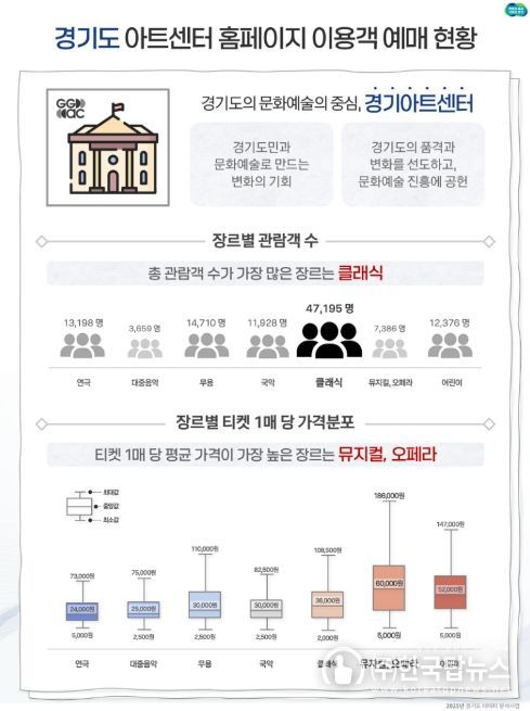 경기아트센터 공연 예매 데이터 분석에서는 클래식 장르 관람객이 약 4만 7천 명으로 가장 높은 선호도를 보였다. 도는 이러한 데이터를 향후 수요자 맞춤형 공연 기획의 기초 자료로 활용할 계획이다.