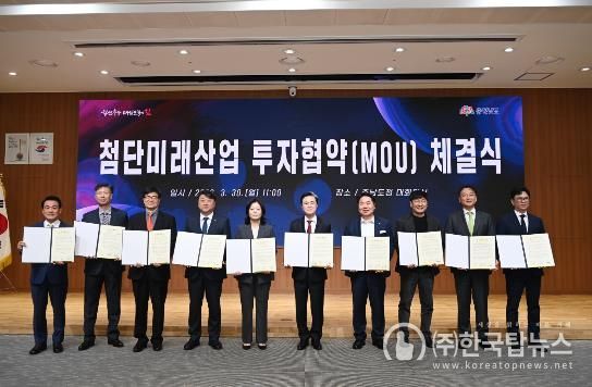 김태흠 지사는 30일 도청 대회의실에서 오세현 아산시장 등 3개 시군 시장·군수, 김동회 디앤알파트너스 대표이사 등 6개 기업 대표와 투자협약(MOU)를 체결했다.