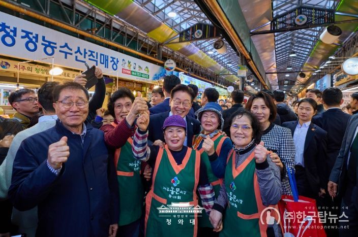 ㈜한국탑뉴스 차복원 기자 | 이재명 대통령은 30일 오후 제주 타운홀미팅 '제주의 마음을 듣다' 종료 후, 김혜경 여사와 함께 1박 2일 제주 일정의 마지막 일정으로 동문시장을 방문했다.