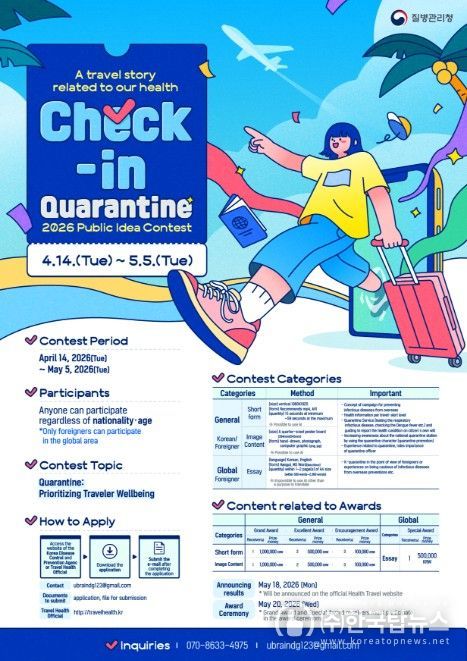 ㈜한국탑뉴스 송행임 기자 | 질병관리청은 건강한 해외여행 문화를 확산하고 여행자 건강 중심 검역에 대한 국민 인식을 높이기 위해 4월 14일부터 5월 5일까지 '체크인, 검역 : 우리가 만드는 여행건강 이야기, 국민 생각 공모전'을 개최한다.