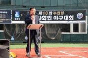 ㈜한국탑뉴스 송행임 기자 | 수원특례시의회는 10월 19일 황구지천야구장에서 열린 ‘제10회 수원컵 전국 사회인 야구대회 개회식’에 참석해 선수들을 격려했다. 이번 대회는 경기일보가 주최하고 수원시야구소프트볼협회가 주관했으며, 전국 사회인 44개 팀이 참가해 뜨거운 열정 속에 경기를 펼쳤다. 이날 행사에는 이재식 의장, 김정렬 부의장을 비롯한 오세철 예산결산특별위원장, 김동은 의원이 함께해 선수단을 응원하며, 전국 각지에서 모인 야구 동호인들과 교류의 시간을 가졌다. 이재식 의장은 축사에서 “직장과 가정을 오가며 바쁜 일상 속에서도 야구에 대한 열정으로 최선을 다하는 선수 여러분께 진심 어린 박수를 보낸다”며 “이번 대회가 지역과 세대를 넘어 우정을 나누는 축제가 되길 바란다.”고 말했다.