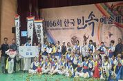 ㈜한국탑뉴스 송행임 기자 | 강릉농악보존회가 9월 28일 충북 영동군에서 열린 ‘제66회 한국민속예술제’ 청소년부 경연대회에서 강원특별자치도 대표로 출전하여 대상인 대통령상 수상의 영예를 안았다. 이번 경연에는 강릉시 관내 초중고교 학생 44명(초 34명, 중 9명, 고 2명)이 출연했으며, 경연장에 학부모 응원단 및 보존회 회원의 뜨거운 응원으로 예술제에 열기를 더했다. 학생들은 지난 7월부터 약 두 달여 간 무더위와 가뭄이라는 강릉의 어려운 상황 속에서도 굵은 땀방울을 흘리며 꾸준히 연습하며 경연을 준비했고, 그 결과 1위를 차지하여 대통령상 수상이라는 값진 성과를 거두었다. 이날 경연에서는 강릉농악의 대표적인 “농사풀이농악”을 선보였다. 이 농악은 과거 농사과정을 몸짓, 손짓으로 표현한 것이 가장 큰 특징으로 소, 볏짚 등 농사 과정의 다양한 소재들을 직접 몸으로 표현하여 하나의 연극이나 마임을 보는듯한 재미를 느낄 수 있다. 이번 경연은 임영민속연구회의 김남일 박사가 총 연출을 맡고, 이용신 전 서울노원구립예술단장이 고증을 담당해 완성도를 높였다. 한편, 올해 한국민속예술제는 문화체육관광부와