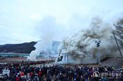 ㈜한국탑뉴스 송행임 기자 | 청도군이 3월 3일 청도천 둔치에서 개최한 '2026 정월대보름민속한마당'이 전국 최대 규모 달집태우기의 위상에 걸맞게 큰 호응 속에 마무리 됐다. 이날 행사에는 약 15,000명의 군민과 관광객이 참여해 정월대보름의 의미를 함께 나누며 한 해의 안녕과 풍년을 기원했다. 낮 시간에는 소원문 쓰기와 민속놀이 체험 등 전통 행사가 이어져 행사장을 찾은 가족 단위 관람객들의 큰 호응을 얻었다. 특히 읍·면 대항 풍물경연대회는 행사 분위기를 최고조로 끌어올렸다. 각 풍물단은 지역의 명예를 걸고 수준 높은 공연을 선보였으며, 관람객들에게 깊은 인상을 남겼다. 화양읍이 우승의 영예를 거머쥐었다. 해가 저문 뒤 월출 시각에 맞춰 진행된 전국 최대 규모의 달집태우기에서는 높이 20m의 대형 달집이 힘차게 타오르며 청도천 밤하늘을 밝혔다. 군민과 풍물단, 관람객들이 함께 달집 주위를 돌며 화합 한마당을 펼치는 장면은 행사의 백미로 꼽혔다. 김하수 청도군수는 “전국 최대 규모 달집태우기와 풍물경연대회를 통해 청도의 전통문화 저력을 다시 한번 확인했다”며 “앞으로도 군민이 함