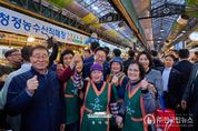 ㈜한국탑뉴스 차복원 기자 | 이재명 대통령은 30일 오후 제주 타운홀미팅 '제주의 마음을 듣다' 종료 후, 김혜경 여사와 함께 1박 2일 제주 일정의 마지막 일정으로 동문시장을 방문했다. 동문시장은 제주시 도심에 위치한 대표적인 전통시장으로, 대통령 부부의 방문 소식에 상인들과 방문객들은 놀라움 속에 환호와 박수로 이들을 맞이했다. 입구에 서 있던 한 외국인 관광객은 어디서 왔냐는 이 대통령의 질문에 “오스트레일리아”고 답하기도 했다. 이 대통령 부부는 셀카촬영과 악수를 이어가며 과일모찌 가게에 들러 온누리상품권으로 한라봉모찌와 딸기모찌를 구입해 즉석에서 강유정 대변인, 하정우 수석 등과 함께 시식했다. 이동 내내 이어지는 셀카요청에도 이 대통령 부부는 반갑게 응했다. 그러자 시장을 찾은 많은 도민들은 이동 중인 이 대통령 부부를 향해 "사랑해요", "와 대박", "화이팅"을 외치는 소리로 화답했다. 이 대통령은 특히 어린이들의 사진 요청에 적극적으로 답했다. "애기 있어요"라는 소리가 들리면 발걸음을 멈추고 아이들과 하이파이브를 하거나 반갑게 셀카를 찍었다. 또한 강아지를