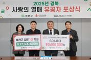 ㈜한국탑뉴스 차복원 기자 | 예천군은 26일 오전, 경북사회복지공동모금회(회장 전우헌)가 주최하는 ‘2025 경상북도 찾아가는 이웃돕기 유공자 포상식’이 예천군청에서 열렸다고 밝혔다. 이번 행사는 희망 2025 나눔캠페인과 나눔 및 선행문화 확산에 기여한 개인 및 나눔봉사단의 공로를 기리고 격려하기 위해 마련됐다. 이날 행사에서 나눔·봉사를 실천한 공로로 사회복지공동모금회장 표창에 학가산 전통메주마을 박상지 대표, 기부와 선행을 실천한 공로로 경북도지사표창에 해인종합상사 황지훈 대표, 최우수 봉사단에 예천군 사랑의열매 나눔봉사단이 선정됐다. 아울러 봉사단 활동에 활발히 참여해 준 김종순 사무국장과 박승용 단원에 사회복지공동모금회장 표창을 수여했다. 예천군 사랑의열매 나눔봉사단은 ‘희망2025나눔캠페인’에서 약 5억 8천만 원의 이웃돕기 성금을 모금했으며, 착한가게 영입, 나눔리더 발굴 등 따뜻한 나눔문화 확산에 앞장선 결과 2년 연속 최우수 봉사단으로 선정될 수 있었다. 경북사회복지공동모금회 손병일 사무처장은 “한해 동안 열심히 활동 해 주신 예천군 사랑의 열매 나눔봉사단에 감사드리며, 내년에도