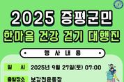 ㈜한국탑뉴스 차복원 기자 | ‘2025 증평군민 한마음 건강걷기대행진’이 오는 27일 오전 7시, 증평 보강천 운동장에서 열린다. 증평군체육회(회장 최재옥)가 주관하는 이번 행사는 군민의 건강 증진과 화합 도모, 가족 중심의 여가 문화 확산을 위해 마련됐다. 걷기 코스는 보강천 운동장을 출발해 천변공원, 김득신 다리, 무궁화길을 거치는 약 3.5km 구간이다. 경사가 완만하고 자연경관이 뛰어나 남녀노소 누구나 부담 없이 참여할 수 있는 코스로 구성됐다. 사전 신청 없이 군민 누구나 자유롭게 참여할 수 있으며, 참가자 전원에게 기념품이 제공되고 다양한 경품 추첨도 함께 마련된다. 체육회는 이번 걷기 대행진을 통해 군민이 함께 어우러지는 건강한 공동체 분위기를 조성하고, 삶의 질 향상에도 기여할 것으로 기대하고 있다. 최재옥 회장은 “보강천변의 아름다운 경관을 따라 가족, 친구들과 함께 걸으며 건강도 챙기고 즐거운 추억도 만드는 시간이 되길 바란다”며 “많은 군민들의 참여를 부탁드린다”고 말했다.