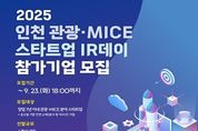 ㈜한국탑뉴스 차복원 기자 | 인천광역시와 인천관광공사는 오는 10월 28일에 개최되는 ‘2025 인천 관광・마이스(MICE) 스타트업 투자유치 설명회(IR 데이)’참가기업을 오는 9월 23일까지 모집한다고 밝혔다. 올해로 세 번째를 맞는 이번 행사는 관내 성장 잠재력을 갖춘 관광・회의·포상관광·컨벤션·전시(MICE) 분야 유망 신생기업(startup)을 발굴하고 투자유치 역량을 강화와 투자유치 기회 제공을 목표로 한다. 공모를 통해 선정된 기업은 투자유치 설명회에 앞서 2주간 투자유치사업계획서 고도화 컨설팅, 투자유치(IR) 피칭 집중 훈련 등을 지원 받는다. 또한, 설명회에서 최종 우수기업으로 선정될 경우 최대 1,500만 원의 상금이 수여되며 투자사와 네트워킹을 통해 후속 투자유치 기회도 제공된다. 참가 자격은 인천에 소재한 창업 7년 이내 관광·마이스 분야 스타트업이며 자세한 내용은 인천관광기업지원센터 누리집에서 확인할 수 있다. 유정복 인천광역시장은 “이번 관광·마이스 투자유치 설명회를 통해 혁신적인 아이디어와 기술력을 보유한 스타트업들이 투자자들과 직접 만나 도약할 수 있는 기