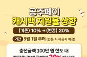 ㈜한국탑뉴스 차복원 기자 | 공주시는 이달부터 지역사랑상품권인 ‘공주페이’의 캐시백 지원율을 20%로 상향해 운영한다고 2일 밝혔다. 이번 조치는 지난 7월 집중호우로 큰 피해를 입은 특별재난지역과 인구감소지역에 대해 정부가 추가경정예산을 편성하면서 지역사랑상품권 관련 국비 지원이 확정된 데 따른 것이다. 이에 따라 충전일과 관계없이 월 100만 원 한도 내에서 해당 월에 공주페이로 결제한 금액의 20%가 캐시백으로 제공되며, 월 최대 20만 원까지 혜택을 받을 수 있다. 최원철 시장은 “이번 공주페이 캐시백 확대를 통해 지역 내 소비를 촉진하고 소상공인을 적극 지원해 지역경제가 하루빨리 회복될 수 있도록 최선을 다하겠다”고 말했다. 한편, 시는 행정안전부의 ‘2024년 지역사랑상품권 발행지원사업 종합지침’에 따라 지난 4월 10일부터 기존 선할인 방식에서 결제 후 일정 금액을 환급(캐시백)하는 방식으로 운영 방식을 전환한 바 있다.