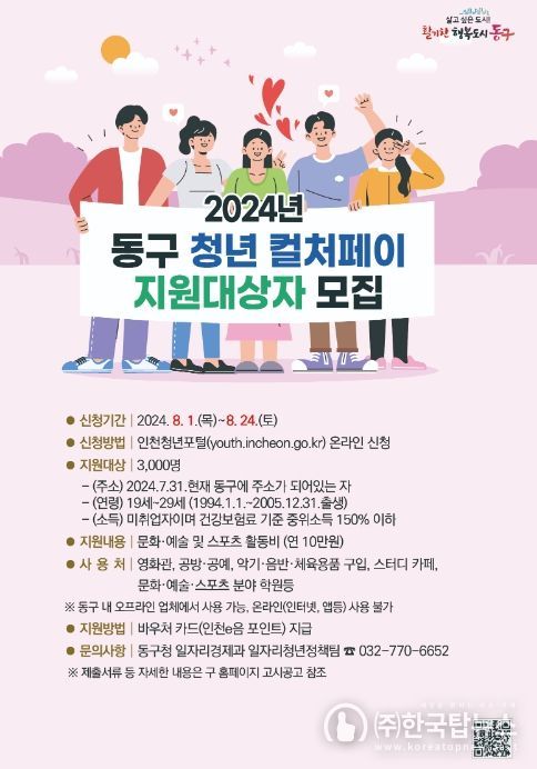 ㈜한국탑뉴스 한민석 기자 | 인천 동구는 관내 청년들을 대상으로 문화・예술 및 스포츠 활동비 10만원을 지급하는 ‘2024년 동구 청년 컬처페이 지원사업’을 시행한다고 밝혔다.