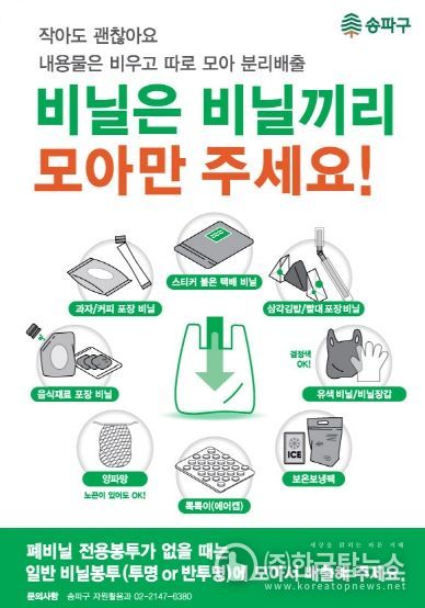 ㈜한국탑뉴스 차복원 기자 | 송파구가 9월 23일부터 종량제봉투 구매 시 ‘비닐 재활용 전용봉투’를 무료로 제공한다.