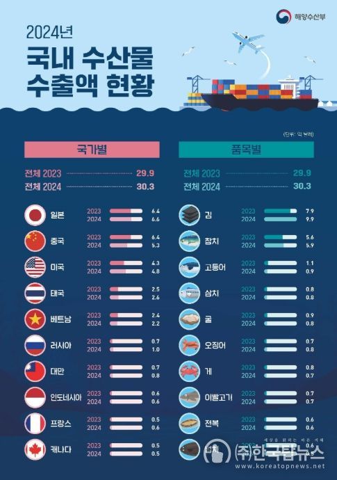 ㈜한국탑뉴스 차복원 기자 | 해양수산부는 2024년 수산식품 수출 총액이 30.3억 달러(전년 대비 +1.2%)를 기록했다고 밝혔다. 주요 품목의 수출액은 수출 1위 품목인 김이 997백만 달러(1.3조 원)를 기록하여 2년 연속 1조 원을 달성했다. 뒤를 이어 수출 2위 품목인 참치는 전년 대비 4.7% 증가한 589백만 달러를 기록했다.