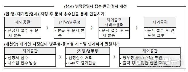 ㈜한국탑뉴스 한민석 기자 | 앞으로 재외동포의 병적증명서 발급을 위한 민원 처리시간이 일주일 이상 빨라질 것으로 전망된다.