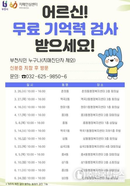 검진 대상은 부천시에 거주하는 시민으로, 치매 진단을 받지 않은 사람이면 누구나 참여할 수 있다. 검진을 희망하는 시민은 신분증을 지참해 해당 일정에 맞는 행정복지센터를 방문하면 되며, 검진 비용은 전액 무료다.