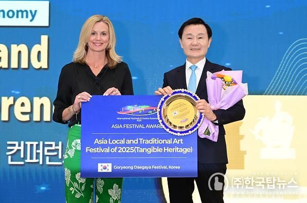 ㈜한국탑뉴스 차복원 기자 | 고령군 대가야축제가 세계축제협회 아시아지부에서 주최·주관하는 2025 아시아페스티벌 어워즈(아시아대표축제)에서 ⌜2025 아시아 지역전통 예술축제(유형유산 부문)⌟ 수상의 영예를 안았다.