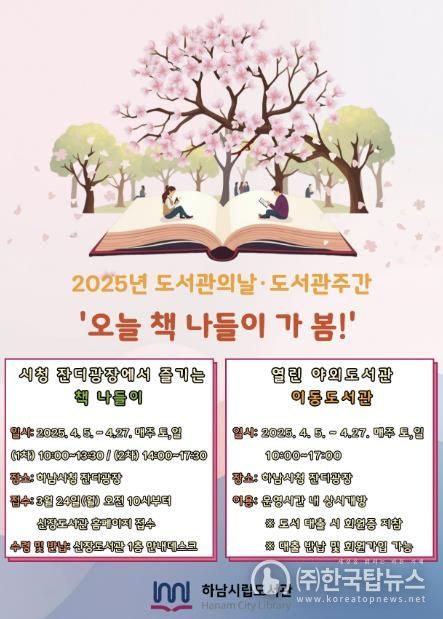 ㈜한국탑뉴스 차복원 기자 | 하남시가 따뜻한 봄바람이 부는 4월, 시민들에게 자연속에서 책과 함께하는 특별한 독서 경험을 선물한다. 오는 4월 5일부터 27일까지 매주 토·일요일 오전 10시부터 오후 5시 30분까지 하남시청 잔디광장에서 야외도서관 행사인 ‘오늘 책나들이 가 봄!’을 운영한다.