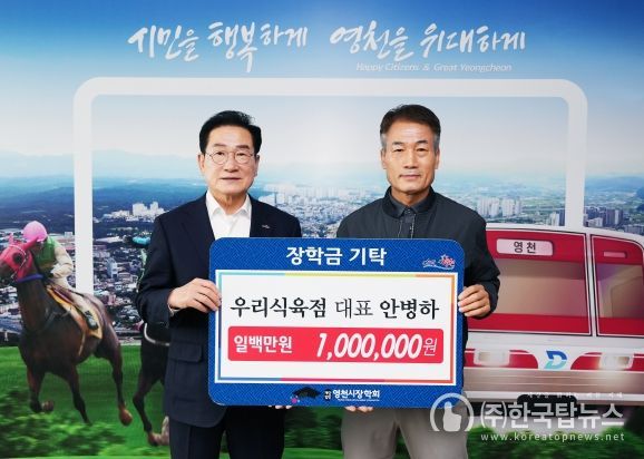 ㈜한국탑뉴스 차복원 기자 | 24일 안병하 우리식육점 대표가 100만원, iM뱅크에서 1억 3,000만원의 장학금을 영천시장학회에 기탁했다.