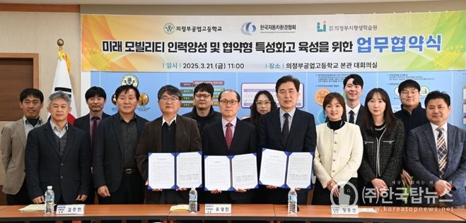 ㈜한국탑뉴스 차복원 기자 | (재)의정부시평생학습원은 지난 21일 의정부공업고등학교, 한국자동차환경협회와 미래 모빌리티 인력 양성 및 협약형 특성화고 육성을 위한 업무협약을 체결했다.