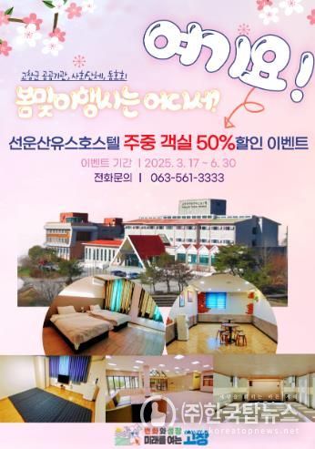 ㈜한국탑뉴스 차복원 기자 | 고창군 선운산유스호스텔이 6월30일까지 주중(일요일~목요일, 공휴일 전일 제외) 객실 이용료 반값 할인 행사를 진행한다고 25일 밝혔다.