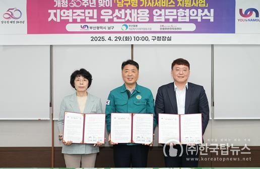 ㈜한국탑뉴스 송행임 기자 | 부산 남구는 지난 4월 29일 남구청 개청 50주년을 맞이하여 추진하는 남구형 가사서비스 지원사업과 관련하여 부산돌봄의료복지사회적협동조합, 오륙도인생후반전지원센터와 3자 공동 업무협약(MOU)을 체결했다고 밝혔다.
