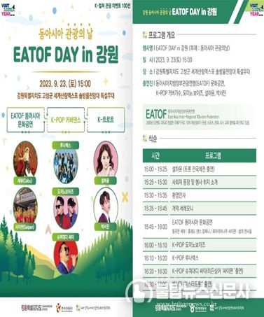 불탑뉴스 기자 | 강원특별자치도는 한국관광공사·한국방문위원회 등 협력기관과 함께 '2023 강원 세계산림엑스포'연계 글로벌 붐업을 위해 9월 23일(15시, 솔방울전망대무대) 'EATOF DAY in 강원'(동아시아 관광의 날) 행사를 개최한다.