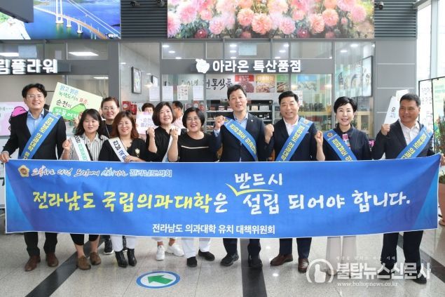 전남도의회 ‘전라남도 의과대학 유치 대책위원회’를 주축으로 진행된 이날 캠페인은 순천역과 목포역 두 곳에서 진행됐으며 순천․목포시의회 의원과 사회단체 등 170여 명이 동참했다.