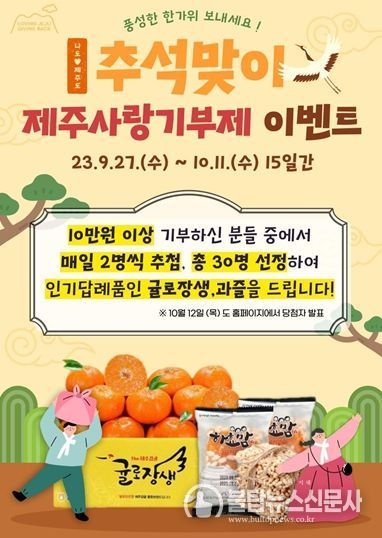 제주도는 9월 27일부터 오는 10월 11일까지 제주고향사랑 기부자를 대상으로 귤로장생 브랜드 감귤 등 인기 답례품을 추가로 증정하는 이벤트도 진행한다.