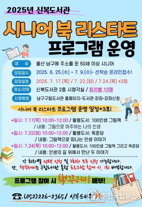㈜한국탑뉴스 송행임 기자 | 남구 구립도서관에서는 지역 신중년과 시니어 세대를 위한 맞춤형 독서 문화 진흥 사업인 남구형 시니어 ‘북 리스타트(Book Re-start)’ 사업을 7월 10일부터 7월 24일까지 추진한다고 밝혔다.