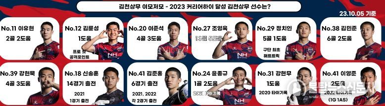 올 시즌 김천은 팀 기록 뿐 아니라 개인 기록 또한 눈여겨볼만 하다. 프로통산 100경기 출전을 비롯해 커리어하이까지 작성 중인 선수들이 많다. 시즌 초 이유현을 비롯해 이상민, 원두재, 김재우까지 네 명의 선수들이 개인 프로통산 100경기를 달성했다.