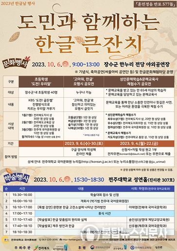 불탑뉴스 기자 | 전북도는 6일 훈민정음 반포 577돌 한글날을 기념해 한글의 아름다움과 우수성을 알리는 ‘2023년 도민과 함께하는 한글큰잔치 행사’를 장수군 의암공원 야외무대에서 개최했다고 밝혔다.