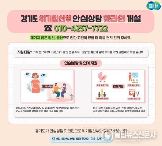 불탑뉴스 기자 | 경기도가 예기치 않은 임신과 출산 등으로 고민하는 미혼모 등 위기에 놓인 임산부라면 누구나 24시간 익명으로 상담을 받을 수 있는 위기임산부 안심상담 핫라인(010-4257-7722)을 개설하고 13일부터 운영에 들어간다.