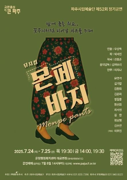 ㈜한국탑뉴스 한민석 기자 | 파주시는 시립예술단 제52회 정기공연으로 광복 80주년을 맞아, 일제강점기를 살아간 소시민들의 저항과 일상을 조명하는 창작 뮤지컬 ‘몬페 바지’를 오는 7월 24일과 25일 총 3회에 걸쳐 운정행복센터 대공연장에서 선보인다.
