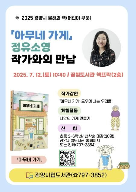 ㈜한국탑뉴스 한민석 기자 | 광양시는 오는 7월 12일 오전 10시 40분, 꿈빛도서관에서 초등학교 3~6학년 학생들을 대상으로 『아무네 가게』의 저자 정유소영 작가 초청 강연을 개최한다고 밝혔다.