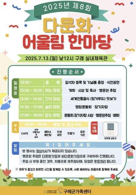 ㈜한국탑뉴스 한민석 기자 | 전남 구례군은 오는 7월 13일 12시부터 18시까지, 2025년 제8회 다문화 어울림 한마당 행사를 개최한다고 밝혔다.