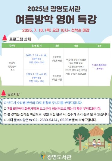 ㈜한국탑뉴스 한민석 기자 | 광명시 광명도서관은 여름방학을 맞아 관내 초등학교 1~2학년을 대상으로 영어 특강 ‘여름 맛 힐링 영어’를 운영한다고 9일 밝혔다.