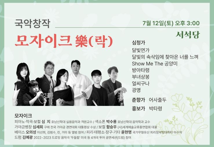 이번 무대 ‘모자이크 樂(락)’은 국악과 재즈가 어우러지는 퓨전 공연으로, 서로 다른 음악적 색채를 지닌 악기들이 하나의 선율로 조화를 이루며, 관객에게 새로운 감동을 전한다. 또한 섬세한 국악 선율과 자유로운 재즈 즉흥연주가 어우러져 전통과 현대의 새로운 감성을 선보이며, 장애 예술인과 비장애 예술인이 함께 무대를 꾸며 화합과 공존의 메시지를 전달할 예정이다.
