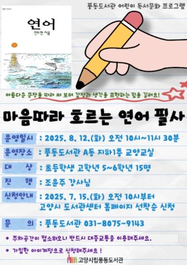 ㈜한국탑뉴스 한민석 기자 | 고양특례시 풍동도서관은 오는 8월 12일 10시부터 11시 반까지‘마음따라 흐르는 '연어' 필사’프로그램을 운영한다고 밝혔다.
