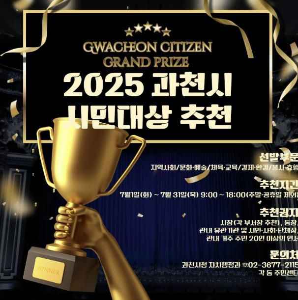 ㈜한국탑뉴스 한민석 기자 | 과천시는 7월 31일까지 ‘2025년 과천시 시민대상’ 후보자를 공개 모집한다. 이번 시민대상은 제40회 시민의 날을 기념해 지역사회 발전에 기여한 시민을 발굴하기 위한 것으로, 오는 10월 1일 기념식에서 시상할 예정이다.