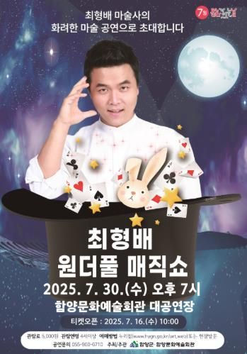 ㈜한국탑뉴스 한민석 기자 | 함양군은 7월 ‘문화가 있는 날’을 맞아 오는 30일 오후 7시 함양문화예술회관 대공연장에서 국내 정상급 마술사 최형배가 출연하는 ‘최형배 원더풀 매직쇼’를 개최한다.