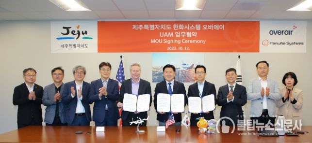 제주도는 12일 오전(현지 시각) 미국 캘리포니아주 산타아나 오버에어 본사에서 제주도-오버에어-한화시스템 3자 간 제주 UAM 산업 생태계 구축을 위한 업무 협약을 체결했다.