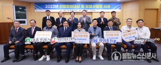 전북도는 16일 도청 회의실에서 김종훈 경제부지사를 비롯 한국노총 전북본부 권기봉 의장, 전북경영자총협회 김동창 상임부회장 등이 참석한 가운데 '2023년 산업평화대상 및 모범사업장 시상식'을 개최하고 노사상생의 선진노사관계 구축으로 산업평화 정착에 기여한 산업평화 대상 2명과 모범사업장 4개 기업에 각각 시상했다.