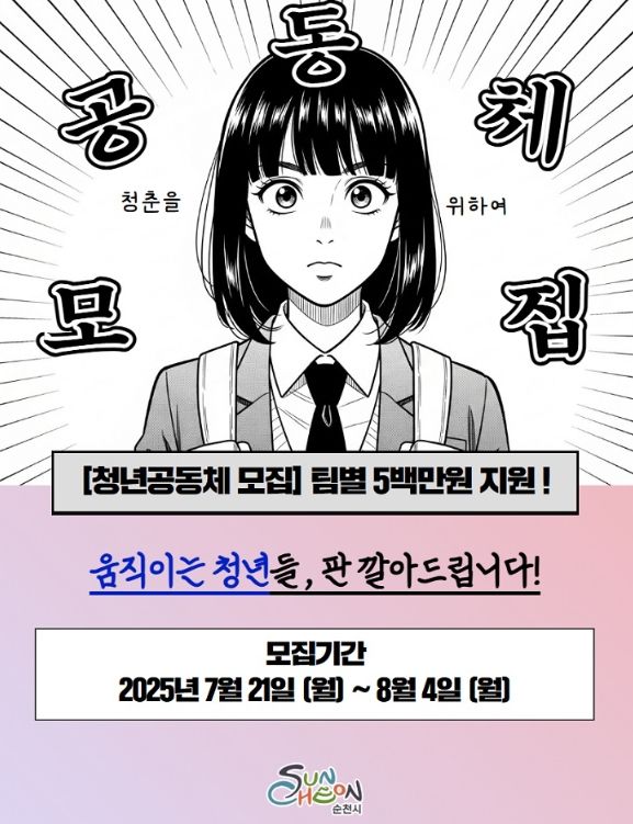 ㈜한국탑뉴스 한기석 기자 | 순천시는 청년들이 지역에서 주도적으로 활동하고 성장할 수 있도록 지원하는 ‘2025년 청년공동체 활성화 사업’ 참여 공동체를 오는 8월 4일까지 추가 모집한다고 밝혔다.
