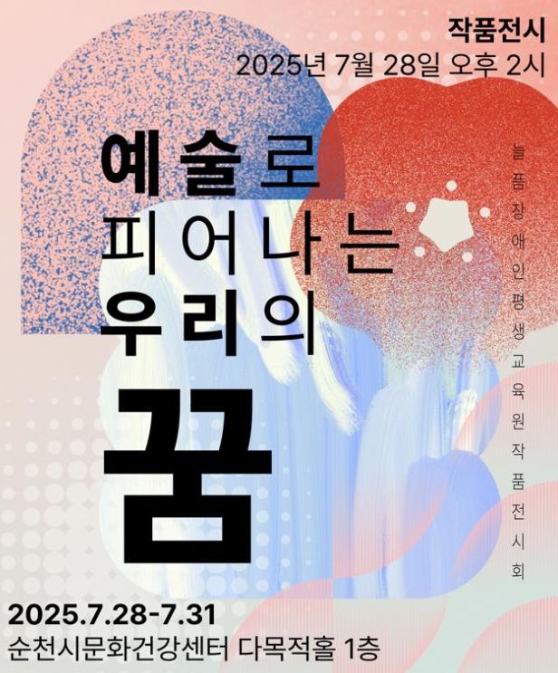 ㈜한국탑뉴스 한기석 기자 | 순천시는 늘픔장애인평생교육원이 오는 28일부터 31일까지 순천시문화건강센터에서 “예술로 피어나는 꿈”을 주제로 장애인 작품 전시회를 개최한다고 밝혔다.