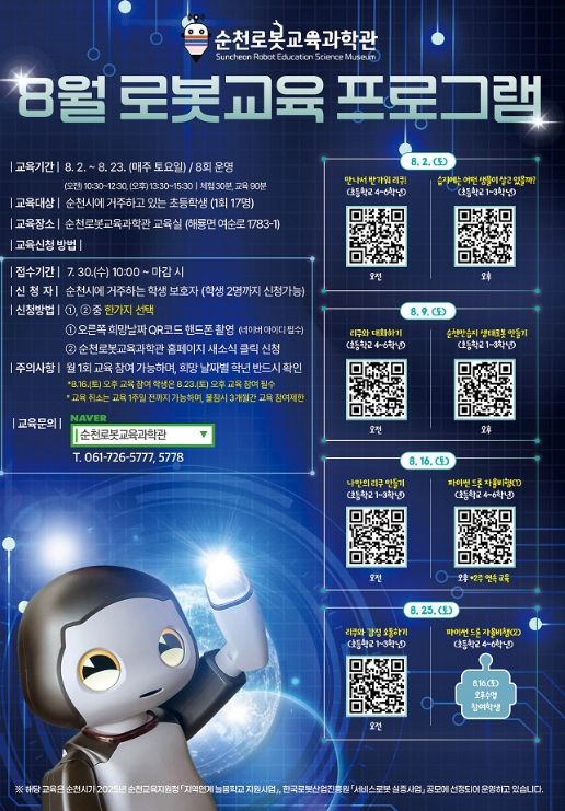 이번 8월달 교육은 순천시와 순천로봇교육과학관 홈페이지 에서 확인가능하며 7월 30일 10시부터 온라인으로 신청할 수 있다.