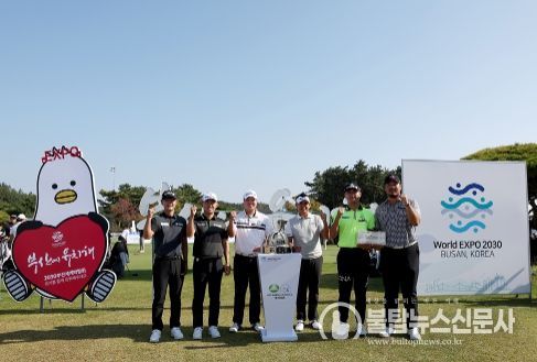 선수들은 부산시를 상징하는 캐릭터 ‘부기’, 우승 트로피와 함께 ‘2030 부산 세계박람회’의 유치를 기원하며 다양한 포즈를 취했다.