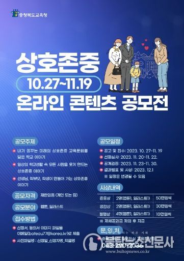 불탑뉴스 기자 | 충청북도교육청은 상호존중 콘텐츠 발굴을 위해 개인이나 팀으로 누구나 참여할 수 있는'상호존중 온라인 콘텐츠 공모전'을 10월 27일부터 11월 19일까지 개최한다.
