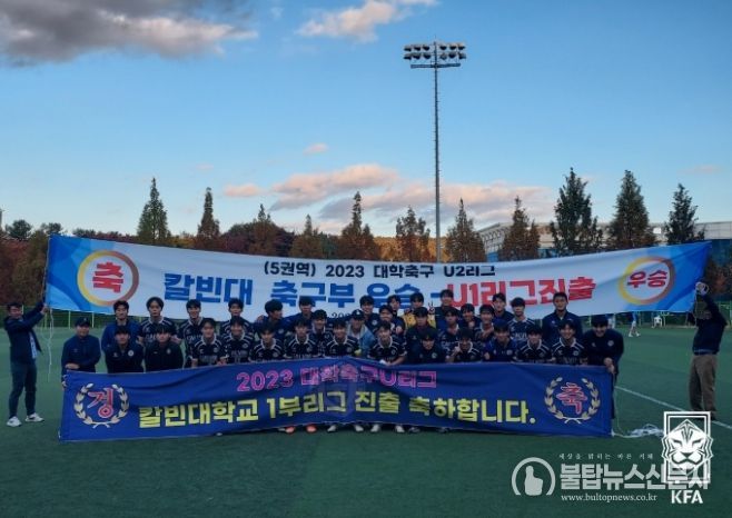 칼빈대는 27일 여주대 운동장에서 열린 U리그2 5권역 최종전에서 송승환의 멀티골과 하지환의 골에 힘입어 여주대에 3-1로 역전승했다. 이번 승리로 승점 29점(9승 2무 3패)을 기록하게 된 칼빈대는 2위 수원대와 승점 동률을 이뤘지만 골득실(칼빈대 +20, 수원대 +15)에서 앞서 승격을 확정지었다. 이로써 칼빈대는 지난 시즌 9권역에서 배재대에 승점 1점 차로 밀려 승격에 실패했던 아픔을 완전히 씻어냈다.