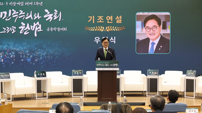우 의장은 기조연설에서 "폭풍 같았던 지난 1년, 우리 국민들 덕분에, 잘 헤쳐온 것 같다"며 "12·3 비상계엄 해제 1주년을 맞아서 국내·외 유수의 학자들과 언론인들을 모시고 12·3 사태의 의미를 되짚어보고, 우리의 민주주의를 더욱 굳건히 할 방안을 논의하는 뜻깊은 자리를 갖게 되어 기쁘다"고 소회를 밝혔다.